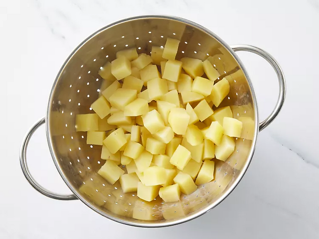 감자는 껍질을 벗겨 깍둑썰기 한 뒤 물에 넣어 삶습니다. 포크가 부드럽게 들어갈 정도(약 10분)로 익히고 체에 밭쳐 물기를 빼 둡니다.