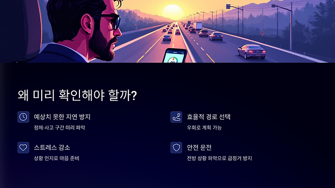스트레스 감소 및 안전 운전: 꽉 막힌 도로 위에서 하염없이 기다리는 것은 상당한 스트레스입니다. 미리 상황을 인지하고 우회하거나, 마음의 준비(?)를 하는 것만으로도 스트레스를 줄일 수 있습니다. 또한, 전방 상황을 미리 파악하면 급정거나 갑작스러운 차선 변경을 줄여 안전 운전에 도움이 됩니다.