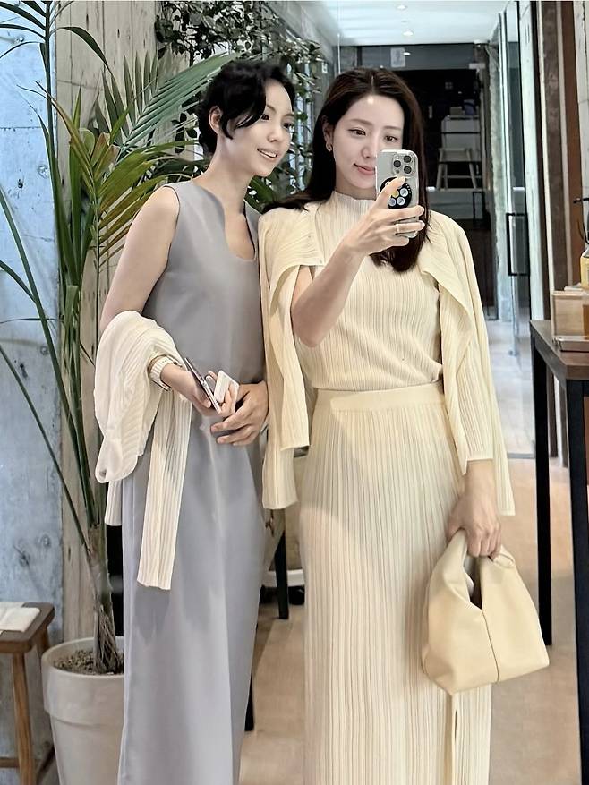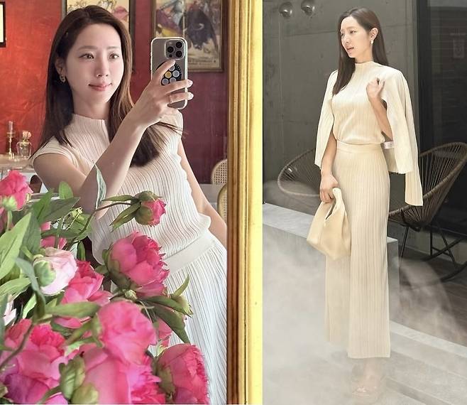 정순주는 플리츠 디테일의 상하의 셋업으로 고급스럽고 절제된 분위기를 연출했습니다.