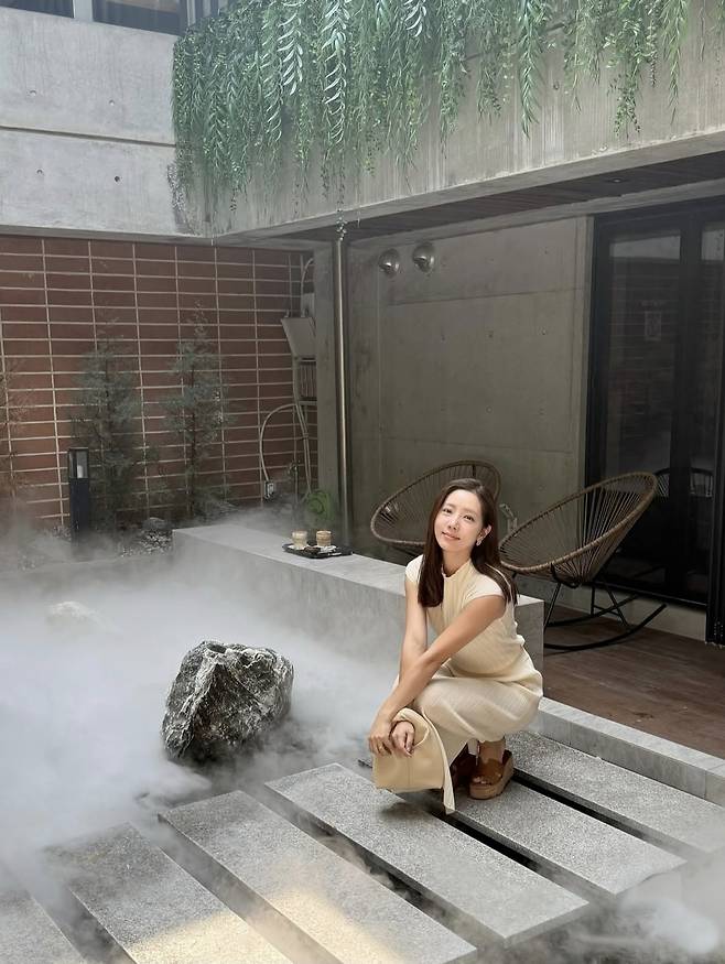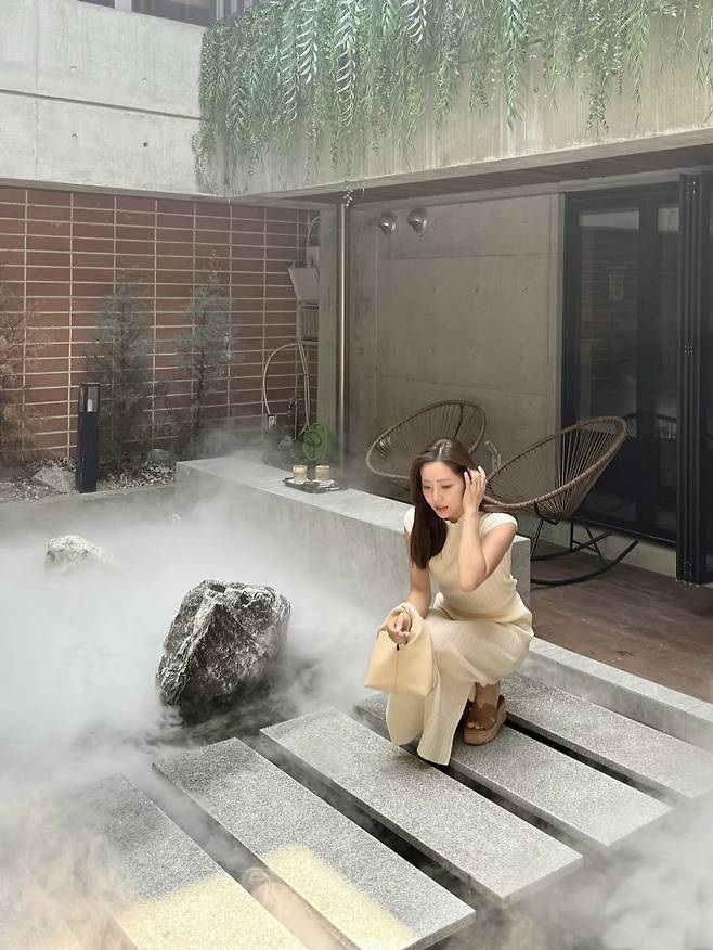 심플한 이어링과 베이지 핸드백으로 디테일을 최소화해 단정하고 세련된 이미지를 강조했습니다.