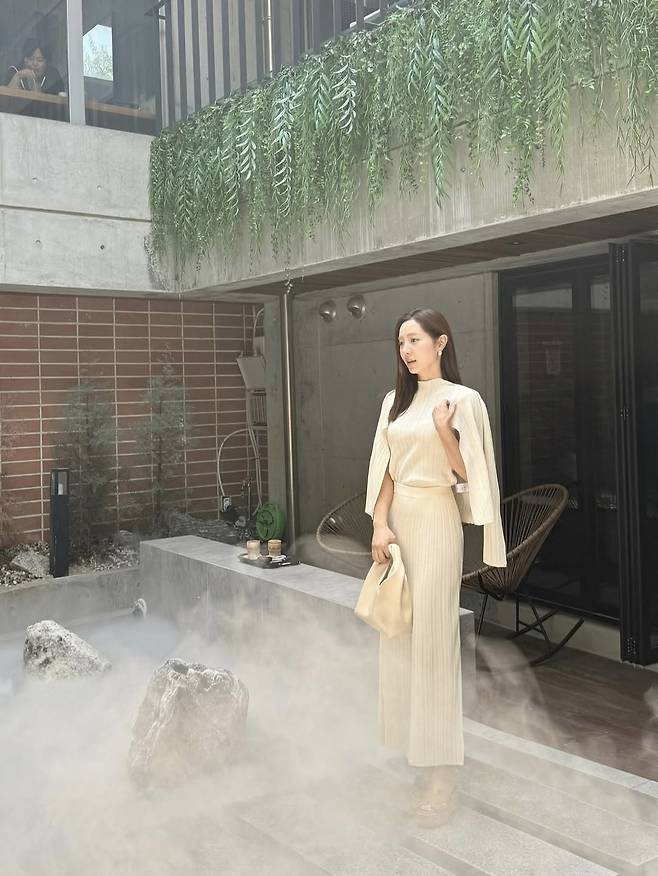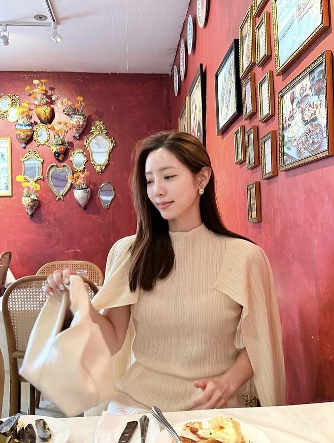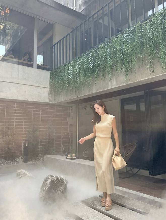 베이지 컬러 톤온톤 스타일링으로 부드럽고 안정적인 인상을 주었으며, 재질의 윤기로 우아함을 더했습니다.