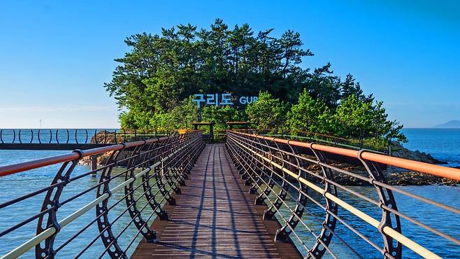 둔장해변 앞에 놓인 무한의다리는 총 길이 1,004m, 폭 2m의 보행교로, 둔장해변에서 출발해 구리도–고도–할미도까지 이어집니다.