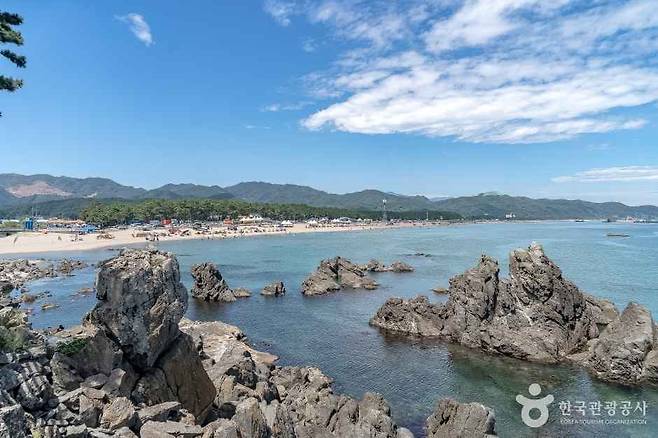 해안 코스를 따라 걷다 보면 발 아래로는 파도 부서지는 해안 절벽이, 시야 앞에는 기묘한 형태의 바위들이 펼쳐집니다. 날씨가 좋은 날에는 물빛이 유리처럼 맑아 바닷속까지 들여다보일 정도. 그 자체로 삼척의 자연이 만든 예술 작품입니다. 탐방로를 따라 오르면 덕산해변, 맹방해변 등 삼척의 대표 바다 풍경도 한눈에 들어옵니다.
