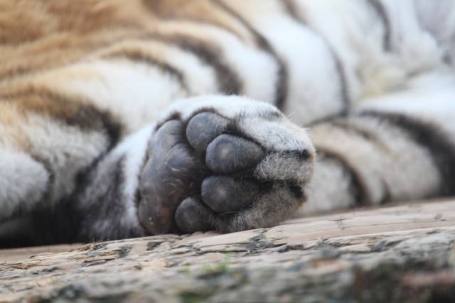 그렇지만 호랑이는 육구 색이 두 가지뿐입니다. 대부분 호랑이 육구는 거무스름하며 흙이 묻으면 그레이 톤으로 보이기도 합니다. 털이 흰 백호만이 핑크 육구.