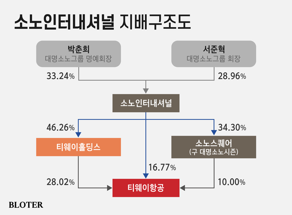 현재 그룹은 ‘소노인터내셔널 → 소노스퀘어(옛 대명소노시즌) → 티웨이홀딩스 → 티웨이항공 → 티웨이에어서비스’로 이어지는 5단계 지배구조를 형성하고 있다. 특히 소노인터내셔널이 중간지주사 격인 티웨이홀딩스를 거쳐 티웨이항공을 지배하는, 이른바 '옥상옥' 형태다.