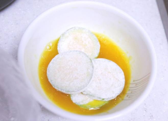 절인 애호박은 키친타월로 살짝 눌러 물기를 제거한 뒤 밀가루나 부침가루를 앞뒤로 묻히고, 달걀물에 퐁당 담가주세요.