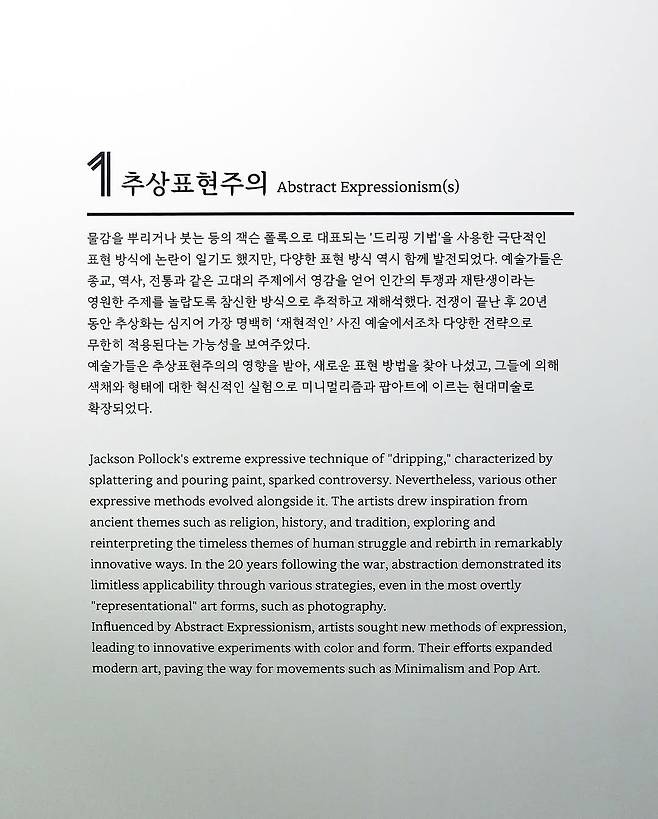 최고의 경매가 약 2,000억원을 갱신한 잭슨 폴록, RM을 눈물 흘리게 한 마크 로스코, 김환기가 뉴욕행을 결심하게 자극한 아돌프 고틀리브, 앤디 워홀에게 영감을 준 재스퍼 존스 등 많은 유명 인사들에게 영감을 준 추상표현주의의 대표 작가들을 한자리에서 볼 수 있다.