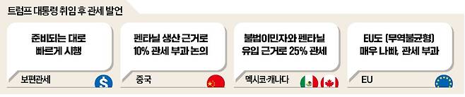트럼프 대통령은 이날 백악관 기자회견에서 대중 관세 부과 시점에 관해 “아마도 2월 1일”이라며 “우리는 중국이 펜타닐을 멕시코와 캐나다에 보낸다는 사실에 근거해 10% 관세를 부과하는 내용을 검토하고 있다”고 했다. 전날 멕시코와 캐나다에 다음달 1일부터 25% 관세를 물릴 수 있다고 한 데 이어 중국에도 즉각 관세를 매길 수 있다고 경고한 것이다.
