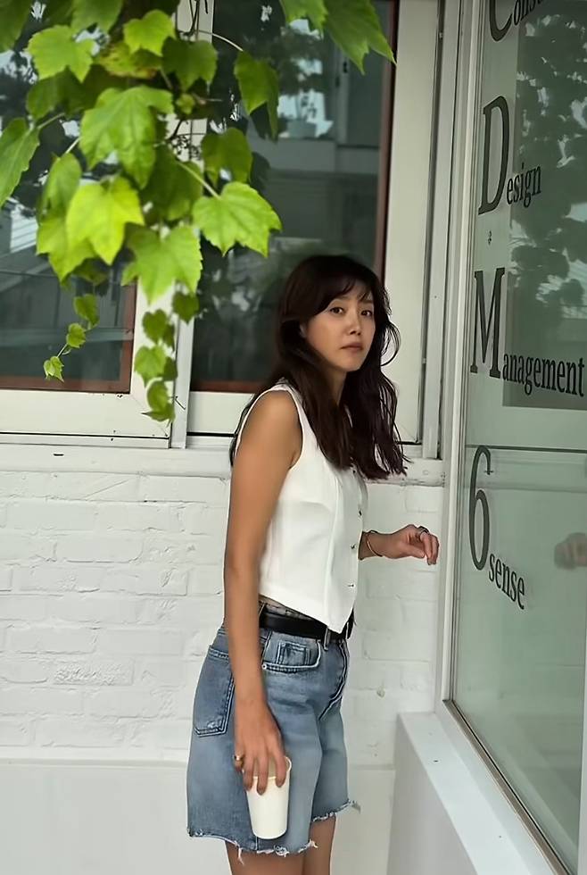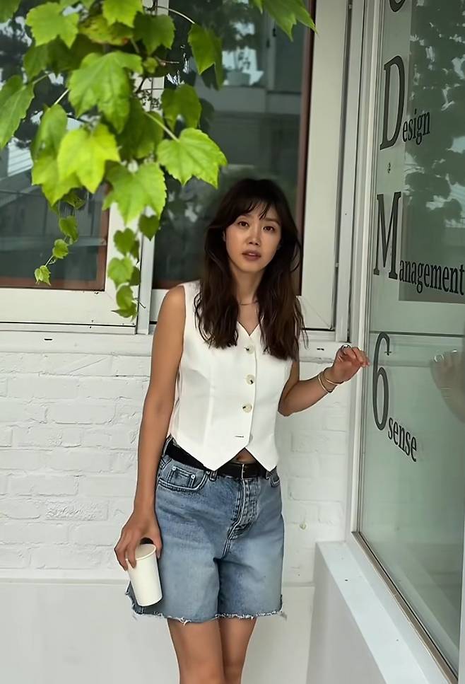 화이트 버튼 베스트를 활용해 미니멀하면서도 세련된 서머 룩을 연출했습니다.