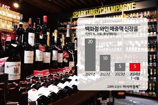 30일 롯데백화점에 따르면 와인 시장 성장률이 해마다 둔화하고 있다. 코로나19 기간 와인에 대한 수요가 급격하게 늘었던 2021년 와인 매출액은 연간 20%나 신장했지만, 지난해와 올해 상반기에는 5%대의 신장률을 기록하는 데 그쳤다.