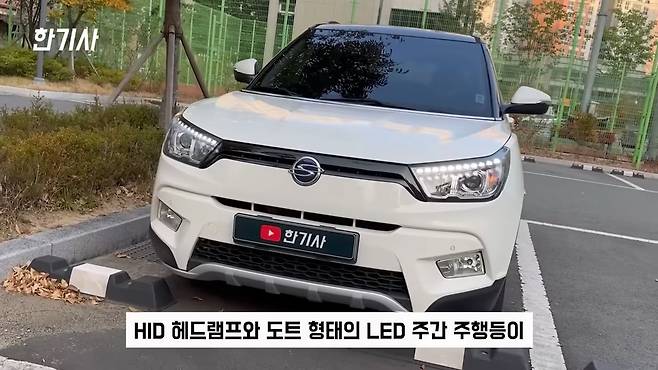 쌍용 티볼리의 장점은 앞서 언급했던 것처럼 예쁜 외관이 있는데, 전면부를 보시게 되면 HID 헤드램프와 도트 형태의 LED 주간 주행등이 굉장히 좀 잘생겼다는 느낌이 드는 것 같아요. 소형차라는 느낌이 안 들 정도? 굉장히 묵직하고 잘생긴 전면부의 디자인을 보여주는 것 같고요.