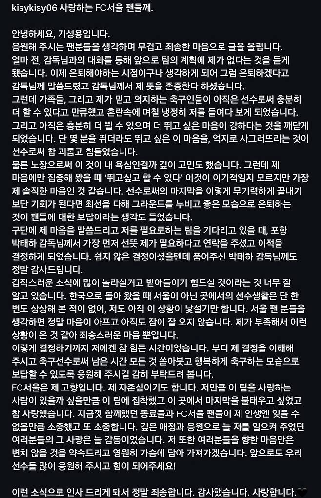 '서울 레전드' 기성용(36)이 진심을 꾹꾹 눌러담은 입장문으로 서울팬에게 작별을 고했다.