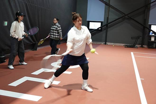 스텝으로 볼과의 거리를 맞추고 나니 급하지 않고 여유롭게 원하는 곳으로 보낼 수 있었고 손목의 고정과 스텝 등 꼭 알아야 하는 테니스의 기본을 배울 수 있었다고 한다.