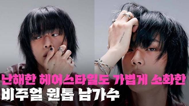 먼저 헤어스타일은 깔끔하게 정돈된 긴 머리를 한쪽으로 모아 굵게 땋아 내린 형태다. 앞머리는 얇게 자연스럽게 내려 얼굴형을 부드럽게 감싸며 세련된 인상을 강조한다. 특히 땋은 머리의 시작점은 귀 뒤에서부터 이어지며 어깨 앞으로 자연스럽게 흐르는 라인이 전체적인 룩에 우아함을 더한다.