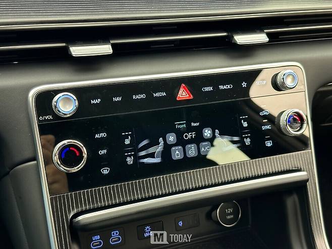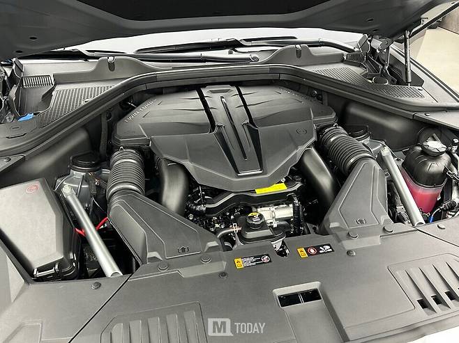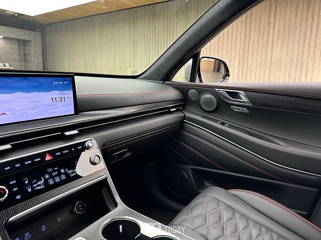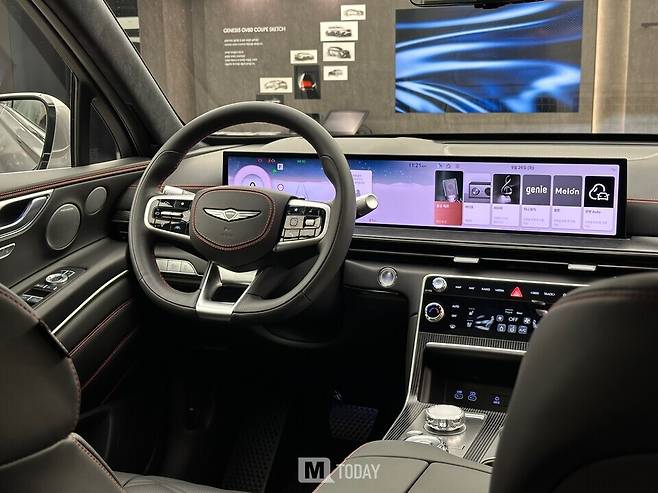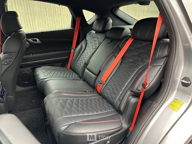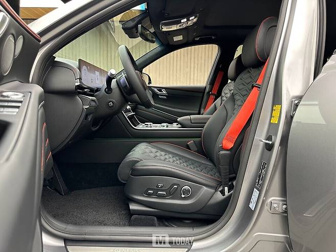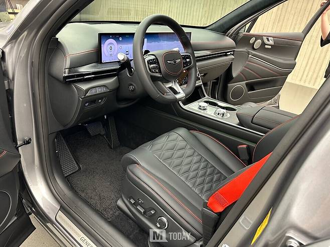 실내는 GV80 페이스리프트와 디자인, 레이아웃 등 전반적으로 동일하다. 운전석에서 조수석까지 길게 이어진 27인치 OLED 디스플레이가 적용됐고, 스티어링 휠은 GV70 스포츠와 유사한 형태다. 시트는 스포츠 버킷 디자인인데 GV80 쿠페 컨셉트 느낌의 스티치 패턴이 눈길을 끌고, 오렌지 컬러의 안전벨트도 강렬하다.