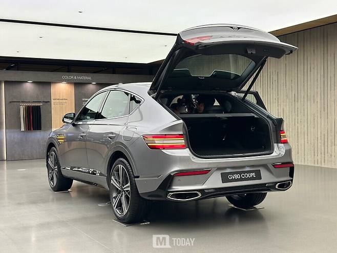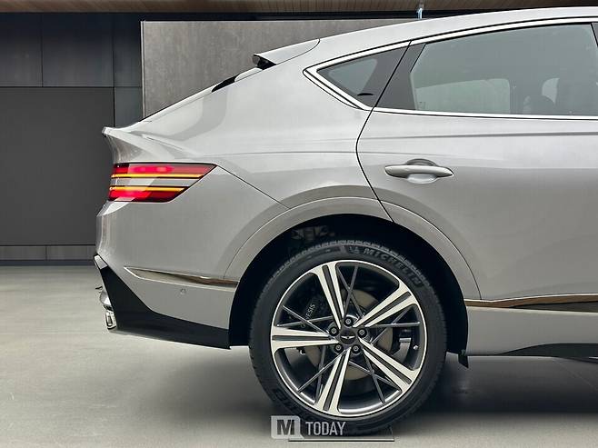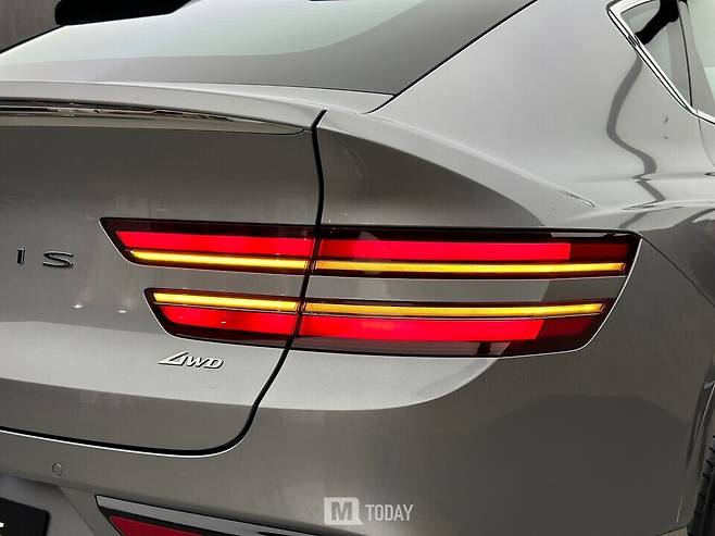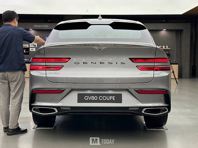 후면부는 트렁크 리드 끝까지 포물선을 그리며 떨어지는 루프라인과 리어 윈드실드가 돋보인다. 쿠페 모델인 만큼 쿼드 테일램프는 GV80와 다른 스타일로 차별화를 뒀다. 내부 그래픽은 면발광으로 GV80 쿠페 컨셉트의 디테일 요소를 일부 채용했는데, 좌우가 길게 연결되지 않은 점은 아쉽다.