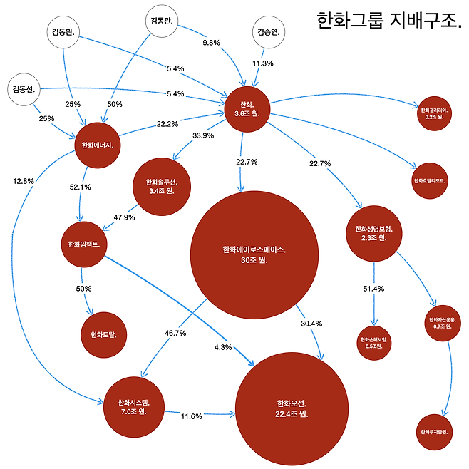 - 김승연(한화그룹 회장)의 지분 22.7% 가운데 절반인 11.3%를 세 아들에게 나눠줬다. 김동관(한화 부회장)의 지분은 9.8%로 늘었고 김동원(한화생명 사장)과 김동선(한화갤러리아 부사장)은 각각 5.4%로 늘었다.