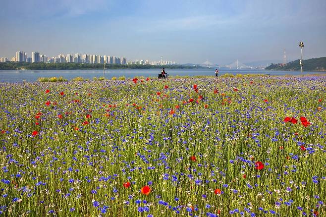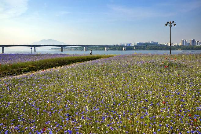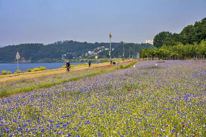 삼패한강공원은 남양주시 와부읍과 덕소동 인근에 위치한 수변 공원으로, 한강과 북한강이 만나는 지점에 조성되어 있다. 계절마다 다양한 꽃이 피어나지만, 5월부터 6월 사이에는 특히 수레국화가 주인공이 된다. 유럽이 원산인 수레국화는 ‘시차화(矢車花)’라는 이름처럼 화살깃을 연상시키는 꽃잎 모양을 가지고 있다.