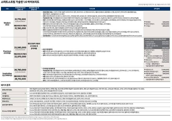 먼저 신형 코나 1.6 가솔린 하이브리드 기준 최상위 인스퍼레이션(Inspiration) 트림 가격은 3,678만원이다. 프리미엄(Premium) 트림 기본사양에 지능형 안전 기술인 전방 충돌 방지 보조(교차로 대향차), 후측방 충돌 경고(주행), 후측방 충돌방지 보조(전진 출차), 후방 교차 충돌방지 보조, 안전 하차 경고, 고속도로 주행 보조, 스마트 크루즈 컨트롤(스탑앤고 기능 포함), 내비게이션 기반 스마트 크루즈 컨트롤(안전구간/곡선로)가 추가된다.