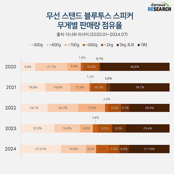 무선 블루투스 스피커 무게별 판매 점유율 차트에서는 어디든지 가볍게 들고 다닐 수 있는 300g 미만대가 27.2%로 가장 높은 점유율을 차지했다. 2020년까지는 ~600g대 제품이 21.7%로 점유율이 더 높았지만, 기술이 발전하면서 제품이 점점 경량화되고 가벼운 무게에도 준수한 음질을 갖춘 제품들이 늘어나 300g 미만 초경량 제품들이 인기를 끈 것으로 보인다.