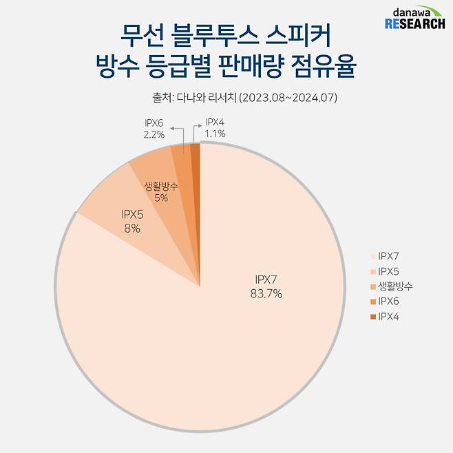 무선 블루투스 스피커는 야외에서 주로 사용하는 만큼 방수 성능도 중요하다. 무선 블루투스 스피커 시장에서 최근 1년간 가장 많은 판매량을 보여준 방수 성능은 IPX7 등급. 강한 빗줄기는 물론 1m 깊이 물속에서도 30분 가량 보호돼, 일시적인 침수에도 문제 없다. IPX7 등급은 무려 83.7% 점유율을 차지했으며, 강한 빗줄기에도 끄떡 없는 IPX5 등급이 8% 점유율로 2위에 오르면서 무선 블루투스 스피커 소비자의 90% 이상이 강력한 방수 성능을 선호하는 것으로 나타났다.