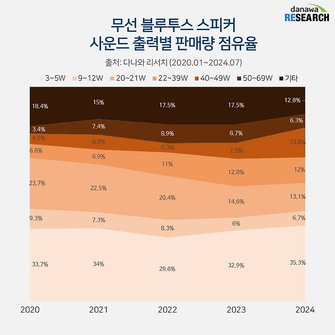 한편 2020년 4.9% 점유율을 차지하던 40~49W 고출력 제품이 2024년 13.8% 점유율로 크게 늘어나 2위를 차지하면서, 실내에서도 사용할 수 있는 고출력 무선 블루투스 스피커 수요도 점점 늘어나는 추세다. 3위 역시 20~21W 출력 제품이 오르면서, 무선 블루투스 스피커 시장은 휴대성과 가성비를 갖춘 모델과 실내에서도 활용 가능한 고출력 제품으로 나뉘는 추세다.