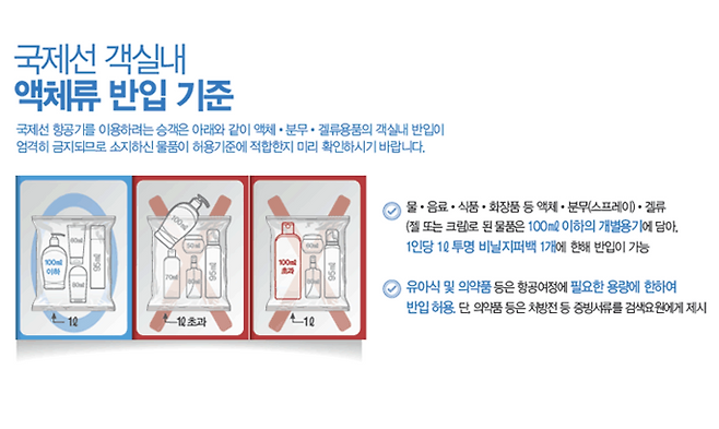 기내수화물의 경우 100ml 이하 용기에 담아 총 1L 이내로만 허용되며, 모든 액체류는 지퍼백(약 20cm×20cm 크기)에 담아야 합니다.