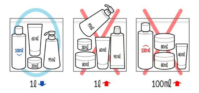 샴푸, 로션, 향수 등 여러 개를 가져갈 수는 있지만 총량이 1L를 넘지 않도록 주의해야 합니다.