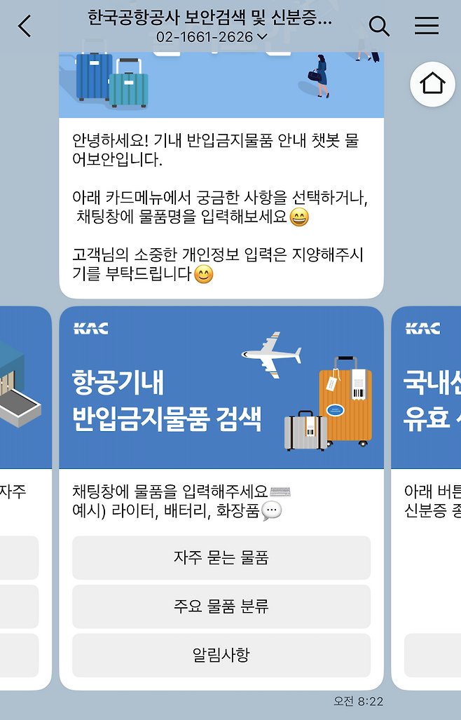 항공보안365 홈페이지나 앱에서는 물품명을 입력하면 기내·위탁 반입 여부를 바로 확인할 수 있으며, 한국공항공사 카카오톡 채널을 추가하면 챗봇으로 24시간 규정 안내를 받을 수 있습니다.