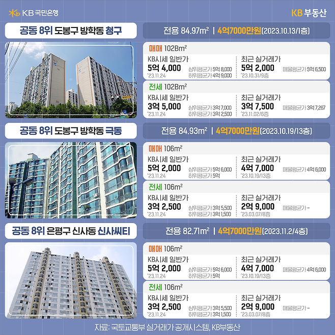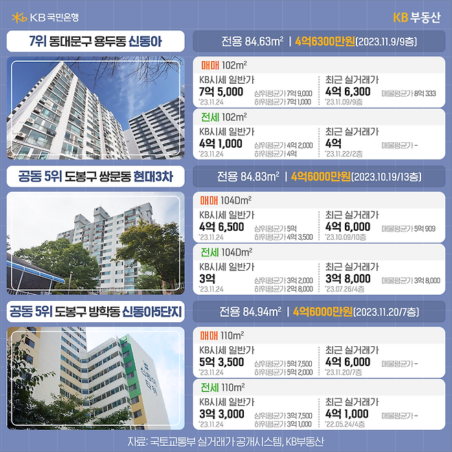 또 다른 곳은 도봉구 방학동 ‘극동’ 아파트 84.93㎡로, 1993년 9월에 지어진 31년차 167세대 단지입니다. 지난 10월 19일 13층 매물이 4억7000만원에 실거래 신고가 됐는데요. 11월 24일 KB시세 기준으로 5억원~5억6000억원 선에 매매가가 형성됐습니다. 단지가 산 밑에 위치하고 있어 조용하고 주변으로 신방학초, 방학중, 신방학중 등 교육시설이 잘 갖춰져 있으나 단지 세대수가 적고, 역시나 걸어서 이용할 만한 지하철역이 없다는 점은 아쉬운 부분이네요.
