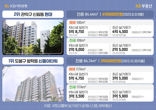 관악구 신림동 현대아파트 전용 84.44㎡가 2위에 이름을 올렸습니다. 1991년 10월 입주한 336세대 규모로, 지난 9월 초 3층 매물이 4억4500만원에 실거래됐습니다. 이는 올해 첫 실거래된 건으로, 직전 거래가는 2021년 8월 6억3000만원(11층)이었습니다. 11월 24일 기준 KB시세는 5억4500만원에서 6억2500만원 선에서 형성돼 있습니다. 관악산 샘말공원이 단지 옆에 위치해 있어 녹지환경이 좋고, 주변으로 신우초, 미림여고, 미림여자정보과학고 등 교육시설도 잘 마련돼 있지만 신림동 외곽지역에 위치한 만큼 지하철과의 거리는 먼 편입니다.