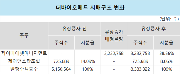 거래가 마무리되면 제이비에셋매니지먼트는 지분 38.56%를 확보하고, 기존 최대주주인 제이앤스타조합의 지분율은 8.66%로 떨어진다. 경영권 주식 양수도 거래가 아닌 대규모 자본유치 방식으로 인수합병(M&A)이 이뤄지는 양상이다.