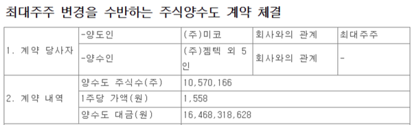 거래가 결렬된 지 열흘 뒤 새로운 원매자가 등장했다. 리튬코리아를 중심으로 한 인수 컨소시엄이 꾸려지면서다. 지엔에쿼티2호조합과 비앤프유니조합, 이노파이언성장1호조합이 새로운 투자자로 이름을 올렸다. 이들은 미코의 보유 지분 전량을 140억원에 사들이기로 했다. 매각단가는 주당 1324원으로 이전 거래보다 저렴해졌다.