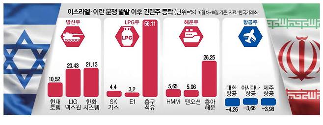 이스라엘과 이란의 분쟁이 격화하면서 국내 증시에서도 관련주들이 요동치고 있다. 무기 수요가 늘어날 것이라는 기대감이 방산주 전반을 끌어올렸고, 유가 등 에너지 가격의 변동에 따라 에너지주와 항공주 주가도 큰 폭으로 움직였다.