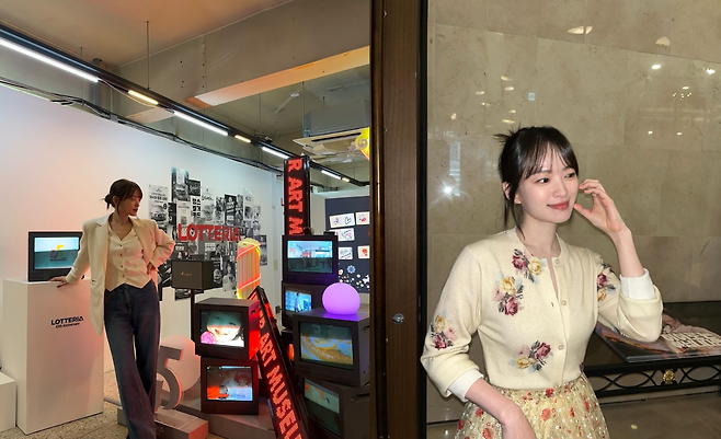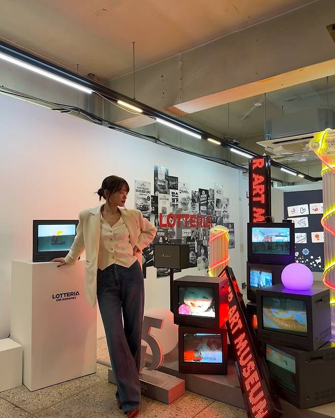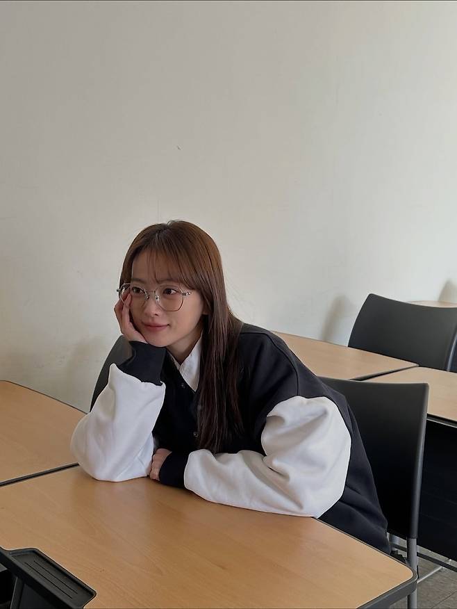 블랙과 화이트 컬러가 과감하게 배색된 바시티 재킷(야구 점퍼)을 착용하여 편안하면서도 영(Young)한 에너지를 발산한다. 이너로는 화이트 셔츠를 레이어드해 단정함을 더했고, 얇은 메탈 프레임의 안경을 매치해 지적인 이미지를 연출했다. 화장기 없는 수수한 얼굴과 긴 생머리가 어우러져 꾸민 듯 안 꾸민 듯 자연스러운 데일리 스타일을 보여준다.