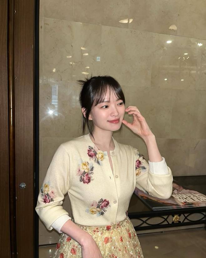 크림색 카디건에 수놓아진 붉은색과 노란색의 장미 자수가 시선을 사로잡는다. 상의와 톤을 맞춘 플라워 패턴 스커트를 매치하여 통일감을 주면서도 화려함을 더했다. 브이넥 라인을 따라 자연스럽게 떨어지는 핏이 여성스러운 실루엣을 강조하며, 내추럴하게 묶어 올린 헤어스타일과 잔머리는 사랑스러운 분위기를 극대화한다. 전체적으로 따뜻한 색감이 어우러져 봄기운이 느껴지는 페미닌한 룩을 완성했다.