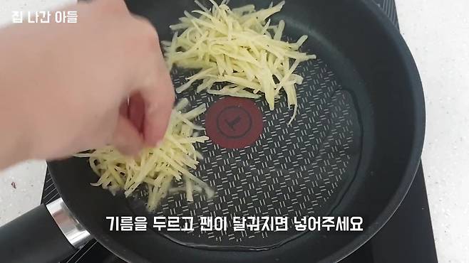 달군 팬에 감자채를 굽기 시작! 충분히 달군 팬에 기름을 두르고, 감자채를 넣어 꾹꾹 눌러가며 노릇하게 구워요.