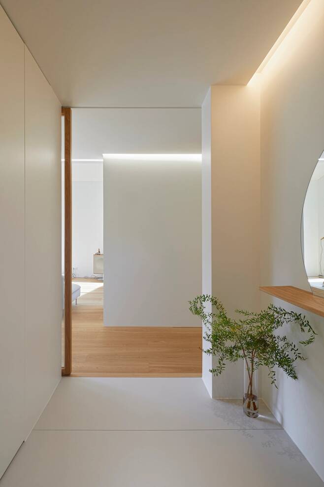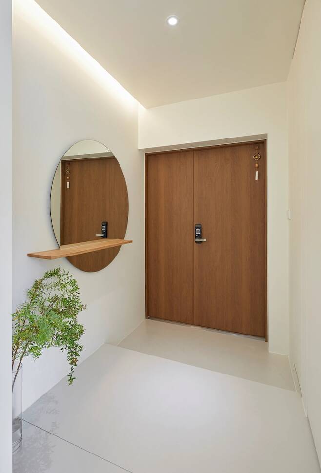현관은 집의 첫인상을 결정하는 만큼 심플하고 따뜻하게 느껴졌으면 했어요. ^^ 그래서 현관 위치와 방향을 여러 번 수정하면서 딱 필요한 신발장과 거울만 두게 되었답니다.