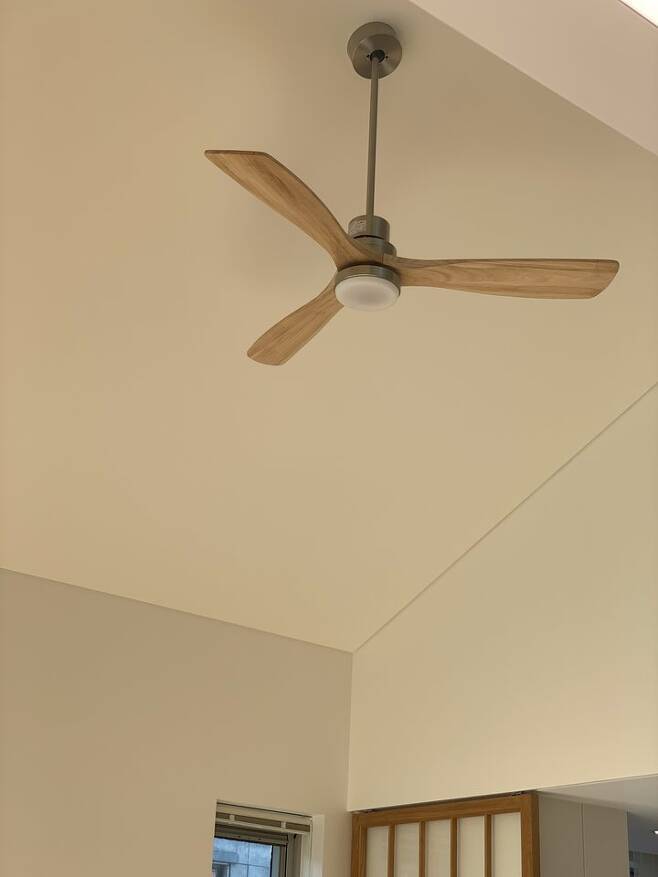 천정이 높고 복층이라 실링팬을 달았어요. 경사면이라 제약이 있었지만 맘에 드는 실링팬을 찾아서 정말 행복했답니다. 우드와 크롬 조합으로 찾고 있었는데 마침 경사면에도 설치된다고 하니 안 할 이유가 없었어요. ^^