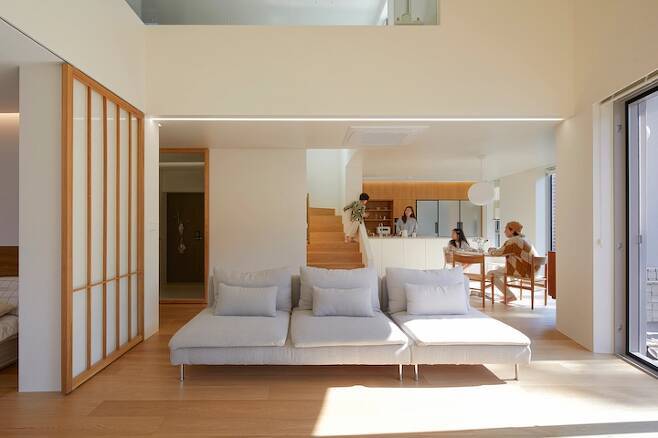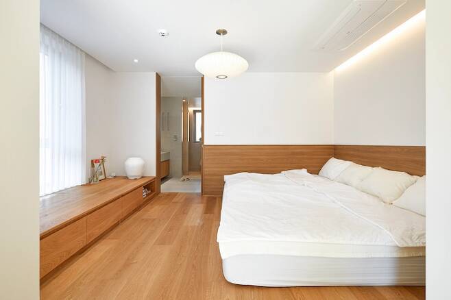 이제 저희 안방을 소개해 드릴게요. 안방은 거실과의 연계성을 중점에 두었어요. 보통, 안방의 프라이빗함을 중요하게 생각하지만, 저희 가족 생활 패턴에서는 거실과 안방은 거의 한 공간 같은 느낌이 좋을 거 같아 그렇게 설계를 했어요.