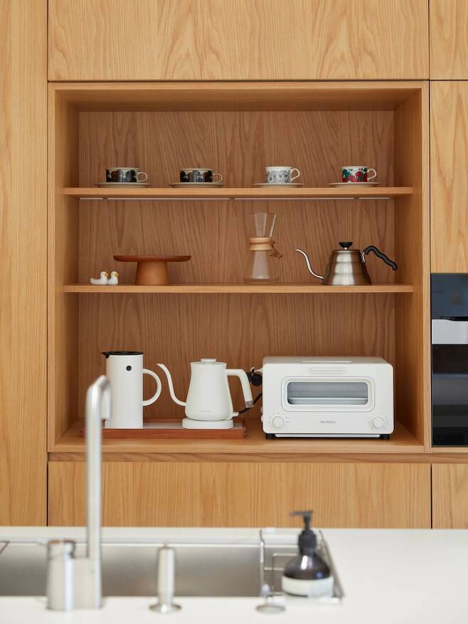그리고 냉장고가 위치한 벽에는 무늬목으로 장을 제작하였어요. 요즘 우드 필름이 잘 나와서 잠시 고민했지만 사용빈도가 높은 곳에는 적합하지 않을 거 같아 무늬목으로 결정했습니다. 오픈장에는 자주 사용하는 물건을 올려두었어요. 원래는 포켓장으로 계획하였지만 예산에 맞지 않아 과감하게 덜어냈어요. 도어가 없으니 편하긴 하네요 ^^