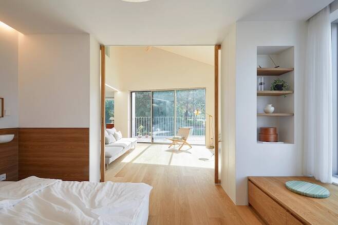 안방 너머로 거실과 테라스가 한눈에 보여요. 저희 집이 남서향이라, 오전엔 햇살에 비치는 싱그러운 숲 뷰를 볼 수가 있고 점점 오후가 되면서 따뜻한 빛이 거실을 가득 채워요. 아파트에 살면서 느껴보지 못했던, 계절의 순간순간을, 그 흐름을 느낄 수 있어서 참 하루하루가 감사해요. 자연이 주는 따뜻하고 조용한 위로에 매일 조금씩 행복해 지고 있는 느낌이에요. 왜 사람은 자연을 보고 살아야 한다는 건지 어렴풋이 알아가고 있는 중이에요. ^^