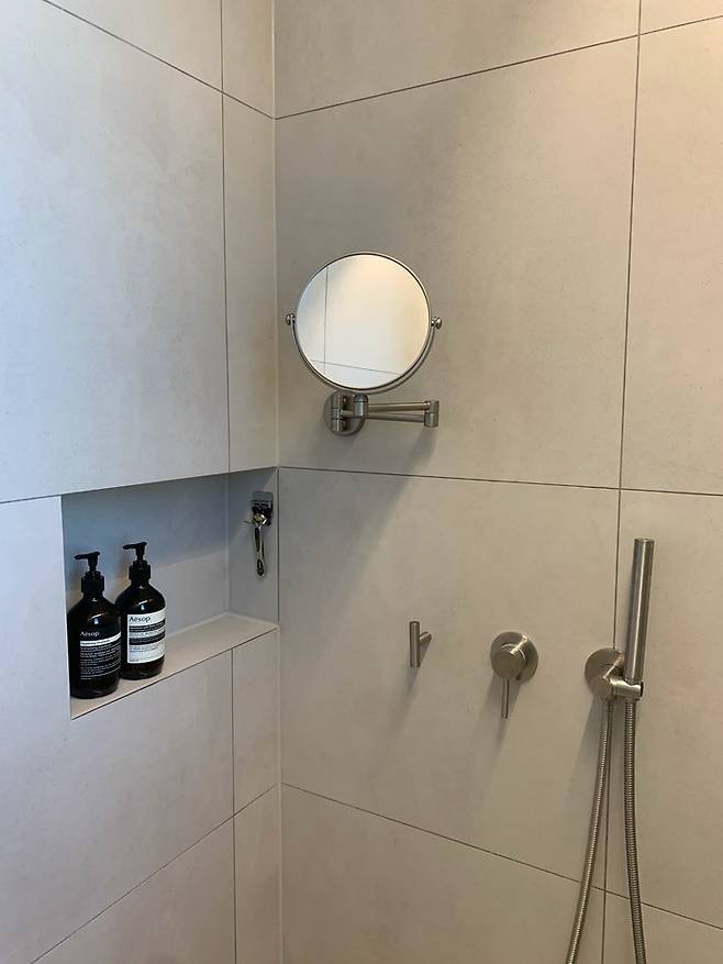 샤워실에는 조적 선반을 제작하여 수납공간으로 사용하고 있어요. 변기는 사진은 없지만 퓨로 직수형 변기로 선택하였고, 샤워실에는 거울이 필요할 거 같아 면도경을 요청드렸더니 이렇게 이쁜 제품으로 넣어주셨어요.