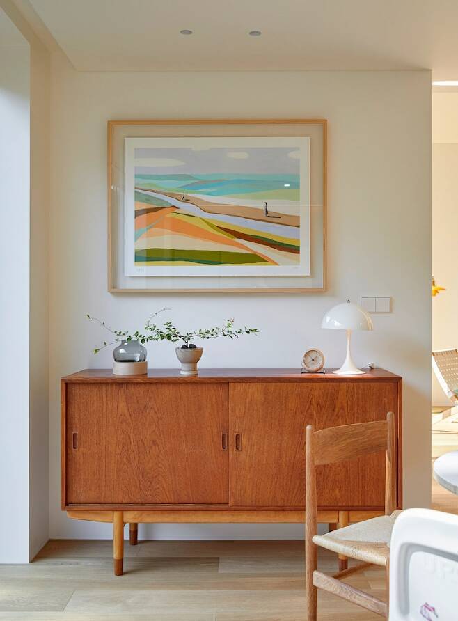 주방 통창 앞 한쪽 벽면은 사이드 보드를 두고 싶어 설계 단계부터 계획했던 공간입니다. 뵈르게 모겐센의 사이드보드를 두고 싶었는데 마침 판매하시는 분을 알게 되어 구매할 수 있었네요. 볼 때마다 뿌듯해요. 예쁜 빈티지 찻잔들을 천천히 모아 가지런히 두는 게 이제 저의 목표가 되었습니다. 서두르지 않을 거예요.