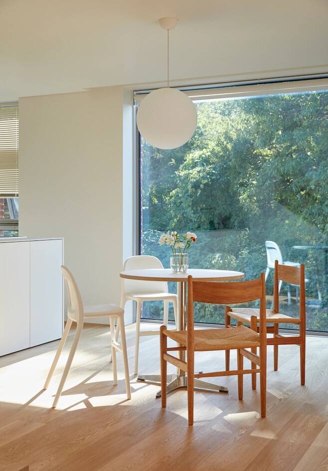 아일랜드 앞으로는 다이닝 식탁을 두었어요. 이곳은 제가 가장 좋아하는 주방 뷰가 있어요. 바로 앞에 집 높이만큼 동산이 있어 늘 푸르른 뷰를 감상할 수 있어요. 뷰를 위해 정말 큰 통창을 만들어서 매일 계절을 느끼고 있어요. 벌써, 가을이 왔네요. ^^
