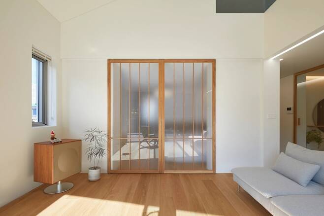 중문의 필요성을 느끼지 못해 과감하게 중문을 달지 않을까 생각했는데 건물주분께서 중문은 꼭 했으면 하셔서 우드 프레임에 유리만 끼워넣은 형태로 제작하였어요. 닫아도 열어도 1/3 정도 보이는 거실이 안정감이 들어서 좋아요.