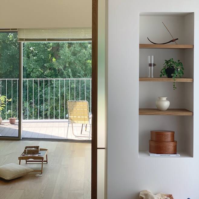 평상 공간 쪽에는 무지주 선반을 제작하여 나름 꾸며보았어요. 아직은 잘 유지하고 있습니다.