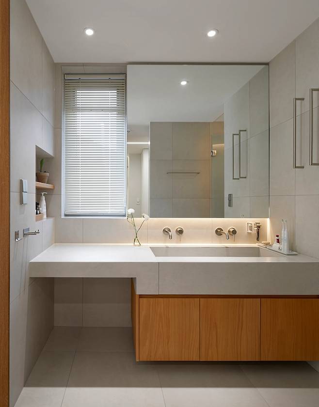 침실에서 거실 쪽 반대편 문을 열고 나가면 바로 욕실이에요. 아이가 둘이라 긴 세면대가 필요했고 수전도 두 개면 더 좋겠다는 생각에 그렇게 계획하였어요. 세면대 밑으로는 주방과 같은 무늬목으로 서랍장을 만들었고, 속옷, 수건 등을 수납하고 있어요.