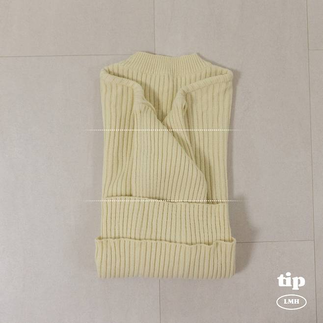 (1) 니트를 반절로 접은 후, 팔 부분을 몸통 위로 가지런히 둔다.