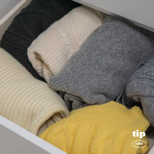 이렇게 니트를 보관하면 찾기도 쉽고, 옷 서랍장도 쉽게 흐트러지지 않는다. 사실 니트 뿐 아니라 티셔츠, 맨투맨 등 모든 옷을 이렇게 보관한다.